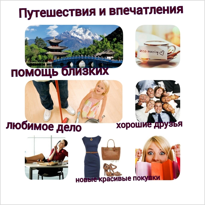 Я определенно вдохнула глоток свежего воздуха!Многие вещи напомнили мне о том,КАК мудрее,10 секретов счастья - это вещь! я мечтаю,мотивируюсь,записываю цели, смотрю на себя с удовольствием, стала уверенней себя чувствовать.Я живу сегодня и радуюсь каждому дню,чем притягиваю еще больше радости! Списки желаемого потихоньку исполняются,отношения налаживаются, деньги даже приходят,пока медленно,но верно.) это мои коллажи - исполнялки)