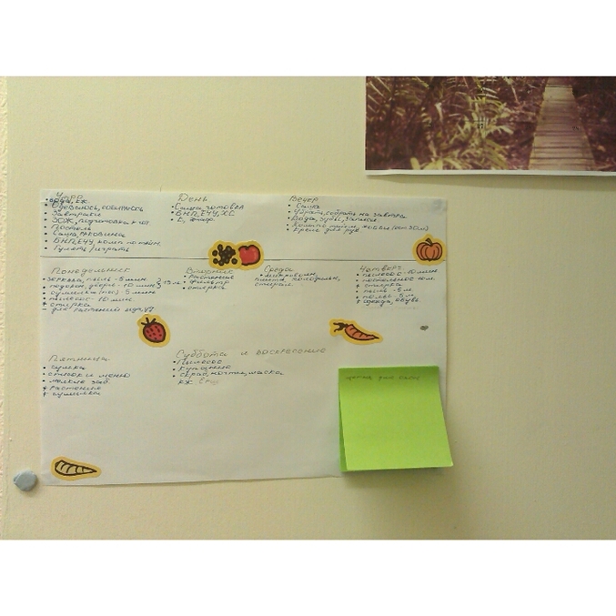 Мой базовый список и календарь ( остальное в контрольном журнале) Ничего не держу в голове,все на виду,ставлю плюсы карандашом что сделала и дописываю карандашом доп.дела (сходить туда, замочить то), на зеленых листиках недостающие продукты. Всё рассчитано граммотно так,что всё селано и остается время. в прошлом я человек хаотичный, в жизни небыло режима,была противником этого, в голове каша.Еще научилась делать все быстрее,оставляя время на более приятные дела.К таймеру пока привыкаю еще.