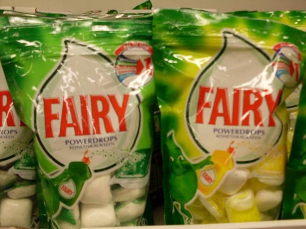 Именно эти - производство Финляндия. В России не продаются. Девочки разные возят: Фейри, Калгонит, W5, LV - все финское. Качество намного лучше, да и подешевле.