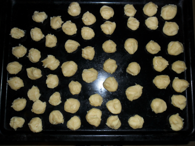 Далее выкладываем тесто на противень, я это делаю с помощью 2 чайных ложичек, ними формируя шарик. С кондитерсикм мешком я не дружу, тут по Вашему желанию. Одно пироженко это шарик величиной с пол чайной ложки. Противень смазывать не надо, так тесто достаточно жирное и потом легко отстает. Единственное нужно стараться как можно нежнее положить шарик на противень не прижимая, тогда проблем не будет. Если все таки где-то пристанет отмывается без проблем.