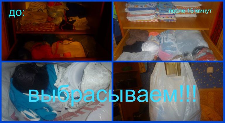 15 минутка - разбор шкафа, все фотографирую. Сегодня старший сын поддержал идею : уборка 15 минут в день - лучше, чем многочасовая в выходные или по вечерам, но 1 раз в неделю))) убрался в своей полочке с тетрадками сам, выбросил 9 ненужных ему тетрадей (исписаных, давала задание 7шт)