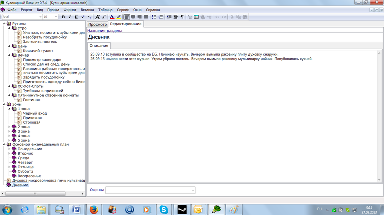 По ходу чтения что бы что-нибудь не забыть начала вести контрольный журнал в Кулинарном Блокноте. Не смейтесь только. Это электронная книга для ведения рецептов. Ничего лучше быстро не смогла придумать. Не знаю имеет ли право он на существование? Может есть другие проверенные эл. книги? Можно вставлять картинки, редактировать выделять описывать каждый пункт.