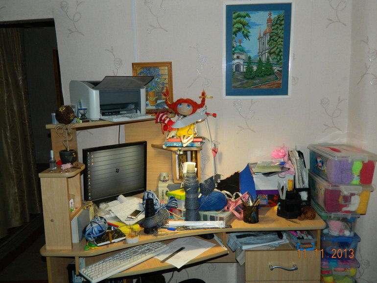 И наконец разобрала завал на компьютерном столе. В этот раз я не стала все убирать по баночкам и раскладывать по полочкам, а просто все сложила в одну корзинку. Потом как будет время и желание, разберу ее.