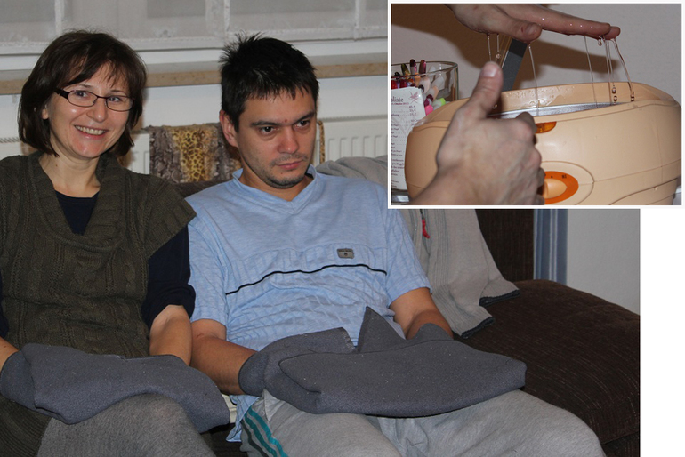В воскресение предложила мужу парафиновую ванночку для рук (чего для себя одной её греть?) Сделали пиллинг, намазали кремом и в парафин, закутались..... сидим ждём 15 минут, телек смотрим.