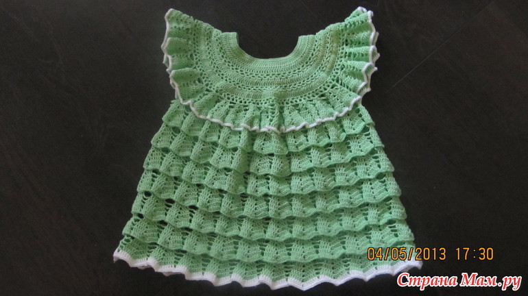 Очень хочу научиться хорошо вязать крючком. Сейчас вяжу платье своей дочурке "Озорной колокольчик", осталось 5 рядов воланчиков.