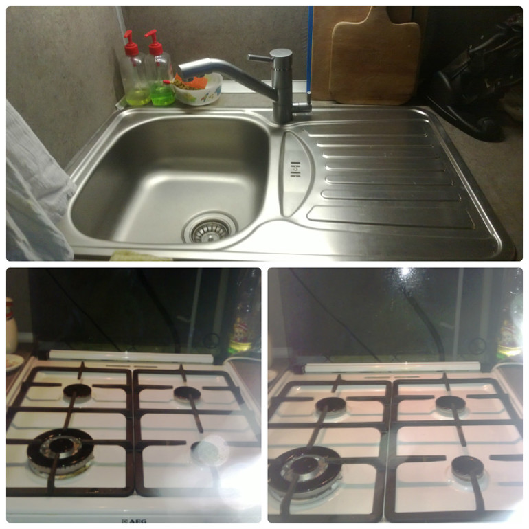 Раковина в шоке - не иначе у хозяйки приступ Золушки! Пока рядом - сразу и плиту начистила - под большой конфоркой было пятно! И с чистой совестью срулила с кухни. И только сегодня, вставляя фото обратила внимание какое грязное у меня стекло за плитой... Пробовала загипнотизировать фотку - грязь не рассасывается.. Придется завтра вечерком начищать! Сегодня мои "маленькие шажочки" уже закончились