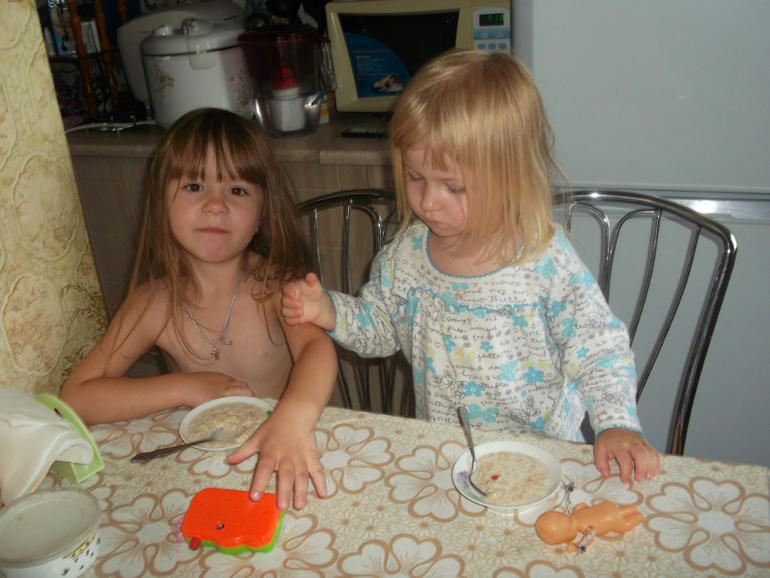 на часах 7.30, у папы прозвенел будильник. Папик встает, собирается, завтракает САМ!!! Я еще лежу, дочи спят.
