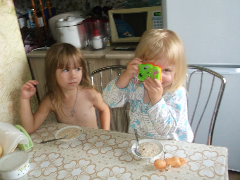 Дочи закончили зарядку и идут завтракать. Варя, как мама, все фотографирует)))
