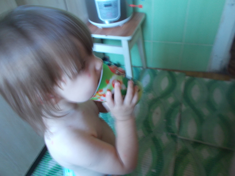Дочечка научилась еще пить без трубочки)) Почти научилась))) Проливает очень много на пол, но, ничего, всему свое время)))