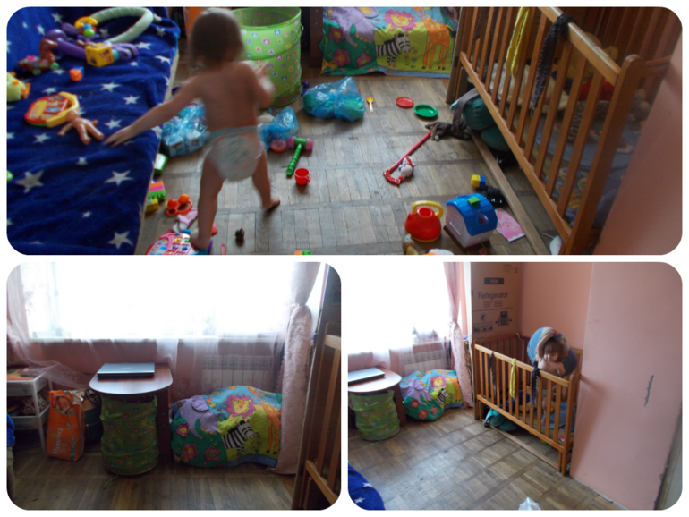 Потом малявка порезвилась))) И за три ЗА ТРИ!!!! минуты я это собрала обратно по местам)) Увы, не сфоткала ТО, что было с мягкими игрухами...