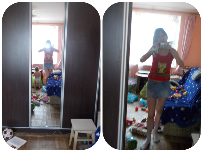 В 6:55 я была уже красавица))) Одела юбочку (мини-мини!) и красную маечку))) Дальше на фотках будет видно))) После купания включила стирку.