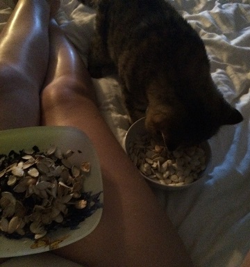 зато сегодня купала кота, завтра ехать на прививку, не вонючим же)))а еще вчера ели семечки и все в шелухе )