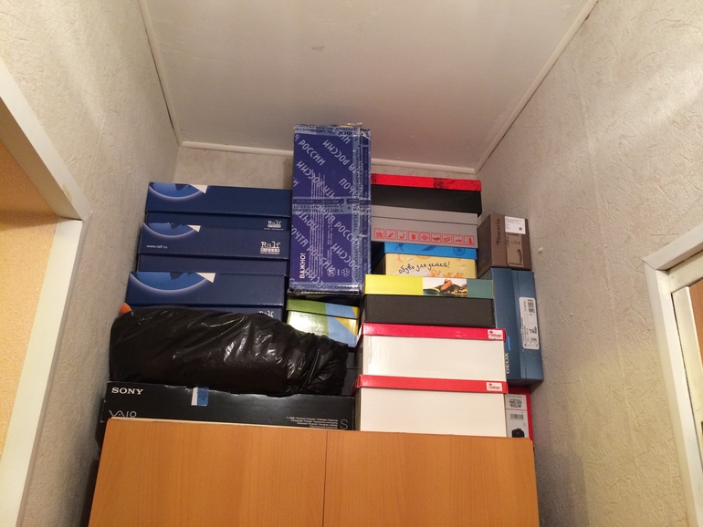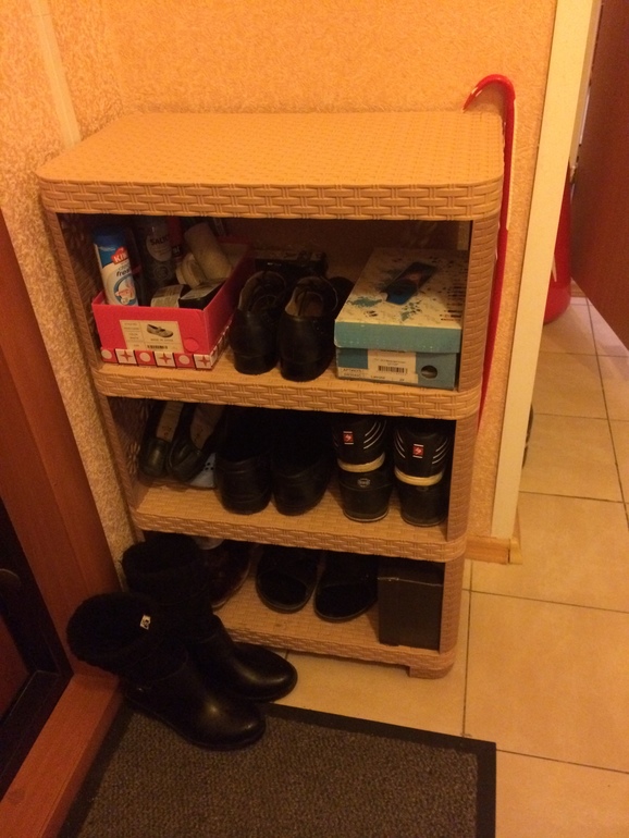 Остальная обувь хранится в коробках, в которых была куплена, на шкафу в нише , несколько зимних\осенних сапог, у которых длинные голенища, хранятся в гардеробной, ботинки от лыж и коньки заняли место на стеллаже на балконе.