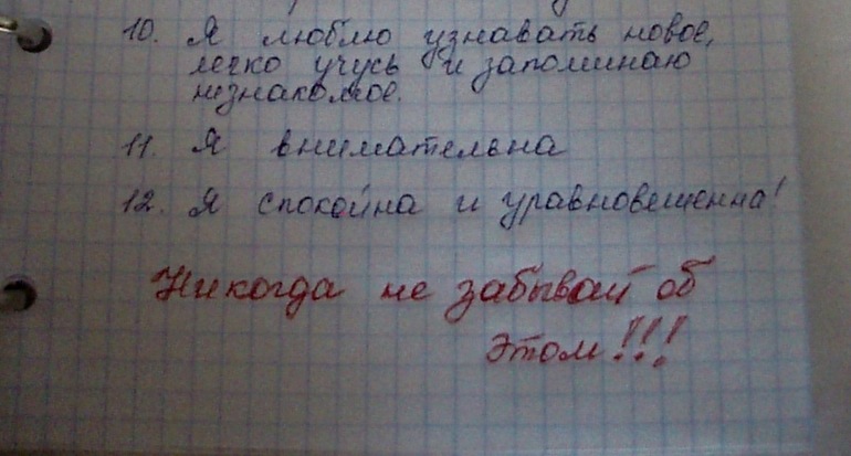 Добавлю, чтобы Люба не ругала за невыполненное основное задание. Хвалилки я написала, 7 глобальных (какая я замечательная дочь, невестка, жена, мама, работник и т.п.) и 12 локальных, ну а что, перефразировав Розенбаума: хвалить, так хвалить! Правда, природная скромность не позволяем мне выставить все написанное, но кое что покажу: