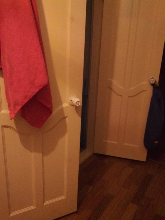 Но раковина сияет.Двери отмыла!!Прочла Келли.А вот и двери в ванную и туалет.Входная темная там не видно ничего.