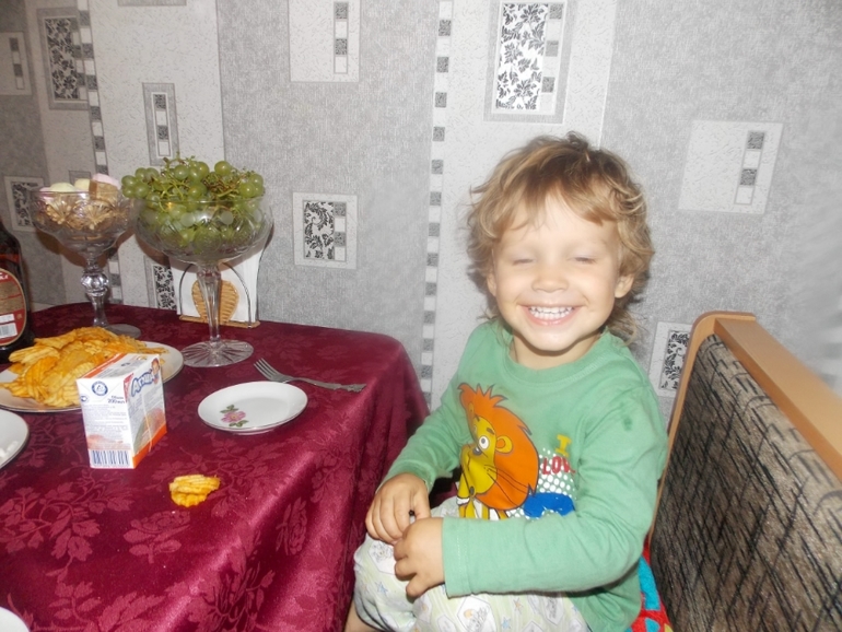 Вот романтический ужин, вот ЛЮБИМЫЙ СЫН, вот любимый папа))))) а любимая мама в ночнушке уже, поэтому не покажу)))) Зацените наш оригинальный стол - сало, помидоры, хреновина, чипсы (можете меня расстрелять, но я без них жить не могу и сыну немного позволяю), сладости, виноград со своей дачи и пиво! Выпили за собранный урожай и за прекращение огня на дружественной нам Украине!!!!