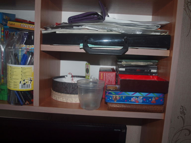 это те самые отсеки на полке над столом, нижнюю уже разбирала до, верхнюю сегодня разобрала, хорошо, в комоде освободился ящик для бумаг