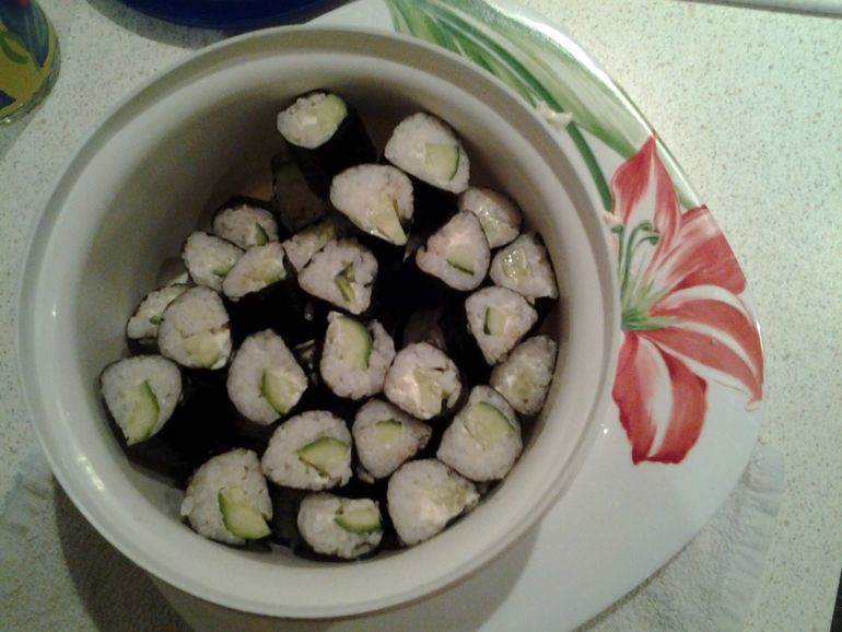 А вот еще интересное! В рамках расхламления решила таки выбросить рис для суши, который стоит с давних пор. И понесла я его в мусорку, но по дороге зацепила кастрюльку и, пока смотрели фильм с мужем, рис сварился. Потом я резко накрутила роллы с огурцом и майонезом (да-да, вот такие чудные. более подходящие продукты отсутствовали), тем самым спасла рис от помойки. Мы с мужем просто ненавидим выбрасывать продукты питания!