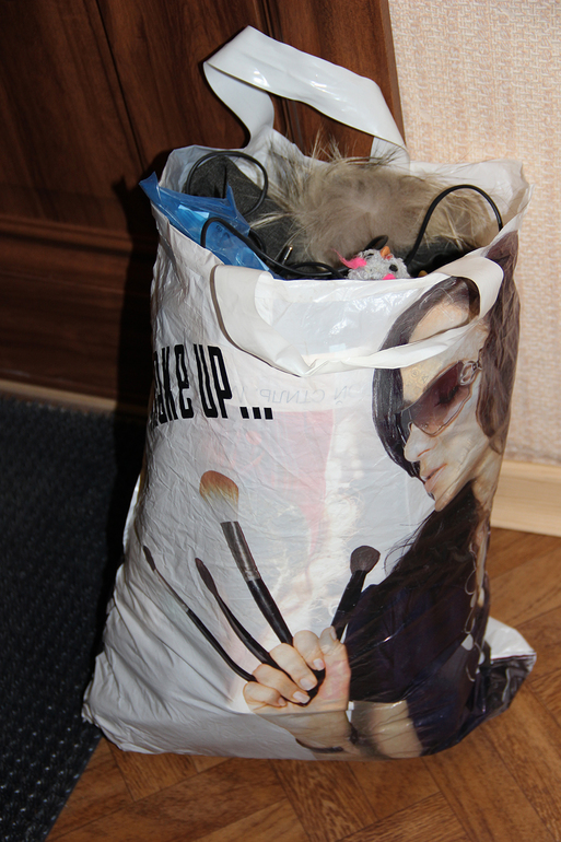 Результатом расхламления стал ещё один пакет. В нём старый мужской пиджак, три старые мужские шапки, гарнитура от старого телефона и зарядник к ней, каталог одежды, какой-то мех от какого-то пуховика