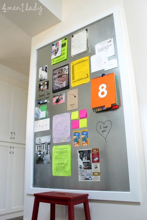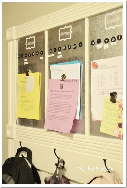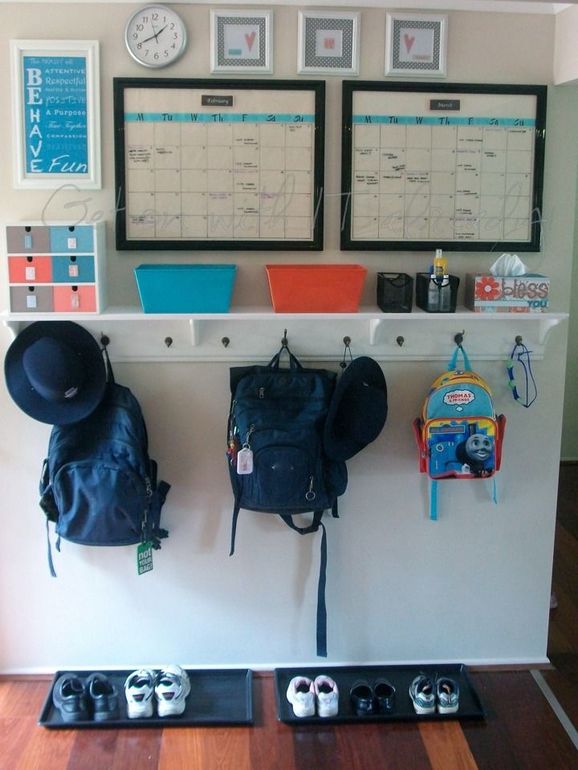 Идею я почерпнула с англоязычных сайтов. Суть в том, чтобы сделать настенный органайзер для всей семьи. За основу берем пробковую или магнитную доску и, если у вас есть дети школьники, небольшую вешалку или шкафчик для рюкзаков и пакетов. Все остальное совершенно опционально, Полочки, ящички, папки, часы, все что угодно. Повесить это можно в детской комнате или в коридоре.