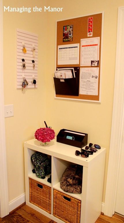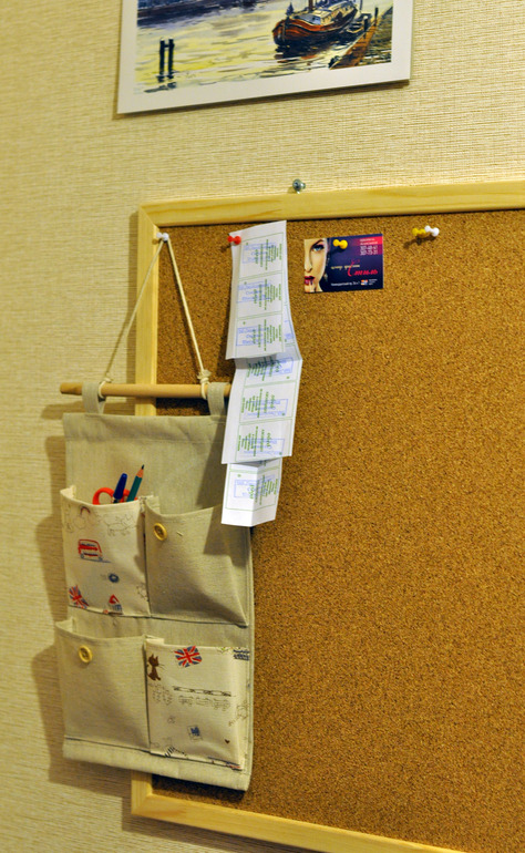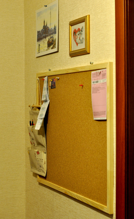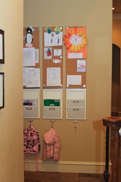 Вот что получилось у меня. Пробковую доску я взяла в магазине Комус. Купила вешалку для одежды и небольшой ....мммм....органайзер с кармашками. На доске у меня пока не так много информации, но планирую намного больше. пока тут счета, талоны на еду, карандаш, ножницы. Кроме того, планируется папка для старшего ребенка, где будет храниться его КЖ и задания на каждый день. За основу взяла детский контрольный журнал. Внизу висят рюкзаки, пакет со сменной обувью и физкультурной формой. Т.е. проблема постоянно валяющегося под ногами рюкзака и потерявшейся формы решена, освободились полки в коридоре, куда постоянно запихивались счета и всякие полезные бумажки. Еще, наконец, удалось задействовать пустые стены в коридоре :))