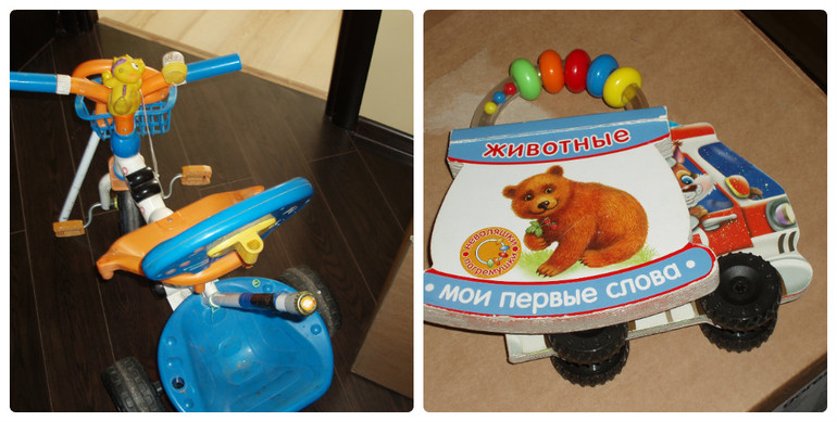 ЗК: ребенок позволил выбросить (отдать) 3 вещи: старый трехколесный велик (в жутком состоянии - весь оклеенный фишками из Дикси и Глобуса, и с дырой в колесе, но... взамен на новый!) и пара книжиц для малышей (в садик отнесу).