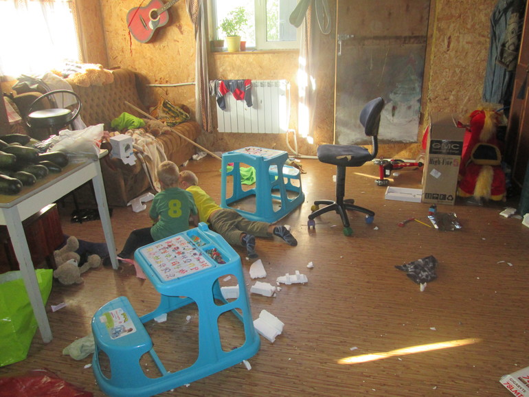 а тут еще домиков-шалашей не хватает, поверх всего:))) из постельного белья и пледов. и все на прищепочках, а потом, когда эти прищепочки отваливаются, все накрывается, и такая куча-мала!!!тоже максимум за полчаса делают мои.