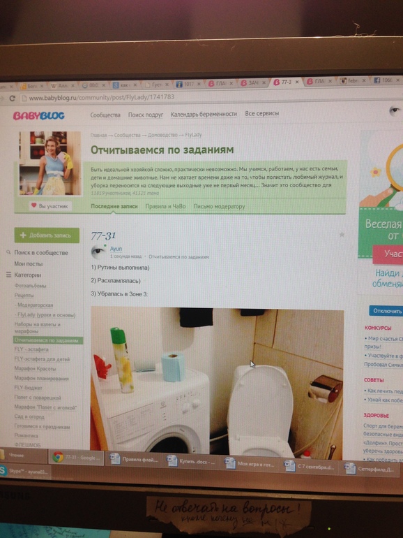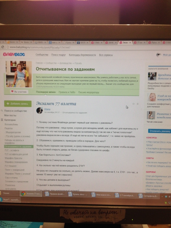 Знаешь, я твою "неординарность" отметила еще в клубе стройнеющих, поэтому следила за твоим взлетом очень тщательно. неужели тебе не хотелось разобраться в системе? Понять для чего делается то или иное задание? Мыть раковину надо не для того, чтобы выполнить пункт номер один, а чтобы привить желание убираться и отличать чистое от грязного. Когда у меня читая раковина капли на кране не то, что раздражают, они просто выводят из себя. И протереть тряпочкой кран занимает 15 секунд, к перфекционизму не имеет никакого отношения. Перфекционизм, это когда ты кран, смеситель и раковину моешь содой и средством для мытья стекол 3 раза в день. Система не должна тебе говорить — В понедельник убираем сбежавшее молоко. Имеется ввиду, что плита у тебя вписана в ОБЯЗАТЕЛЬНЫЕ утренние рутины. которые ЕЖЕДНЕВНЫЕ. Спорт — это отлично, мировозрение — прекрасно. Но из утренних рутин по ХОЗЯЙСТВУ у тебя трусы и посуда.Пункт 52 — меня убил. Я даже не поняла ты в корзину складываешь или оттуда вытаскиваешь шмотье? В моем понимание "приготовить одежду мужу" это постирать, погладить и повесить на плечики рубашку и костюм. Дальше, насколько я помню ты забросала Клуб стройнеющих своими фото. Как человек, который худеет такое может писать в п.71?А ты я так понимаю не многодетная мать и не рабочая лошадь (детей не нашла у тебя). Я не знаю, как оценят твой диплом, но так как ты человек читающий ... я бы как минимум подумала о том надо ли тебе быть хорошей флай