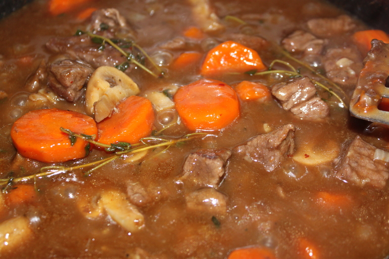 надо: говядина 400г, говяжий бульон 200 мл, оливковое масло 60 мл, репчатый лук 1 шт (около 100гр),Ю чеснок -2 зубчика, морковь - 2 шт средних ( 200-250 гр), шампиньоны 100гр, мука 2 ст ложки, пиво гиннес темное - полбутылки (200мл примерно), свежий тимьян 4 веточки, петрушка 15 гр