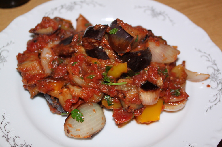 нужно: баклажаны 400гр (два средних), перец сладкий желтый - 200гр -это один крупный примерно, я взяла два- люблю болгарские перцы, лук репчатый - 150 гр (две небольших луковицы), корень имбиря свежий - 40 гр, чеснок - 5 зубчиков, перец чили зеленый (острый) -1 шт, см 7-10 длиной, семена тмина и семена укропа - по 1 грамму, кориандр молотый - 1 гр, томаты в собственном соку - 400гр, кинза - 10гр, мята - 10 гр и соль,перец - по вкусу)