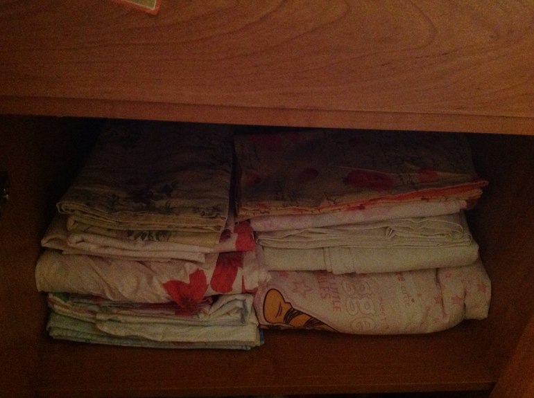 7. Наводим порядок в постельном белье - старое, рваное и не любимое - на тряпки супругу в гараж!!! Честно, всё старое, но всё сейчас нужно… Всё бельё аккуратно сложила на полочке:
