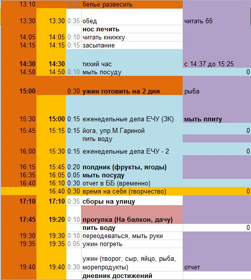 Отчитываемся по заданиямЗдравствуйте феечки! С утренними рутинами у меня всё супер. Наконец-то всё устраивает, А вот с дневными и вечерними надо ещё что-то делать, наверно ЕЧУ перенесу на утро. ДР - для меня это время с обеда до полдника.