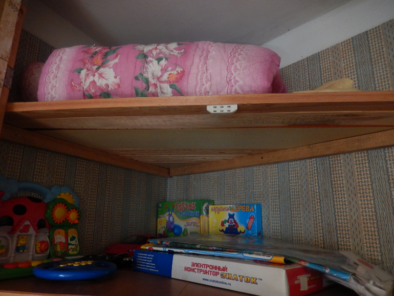 Убрала паутину веником, протирать позвала мужа, моего роста не хватило :) На верх решила закинуть одеяло - самое место для большого и лёгкого. На второй полке крупные игрушки.