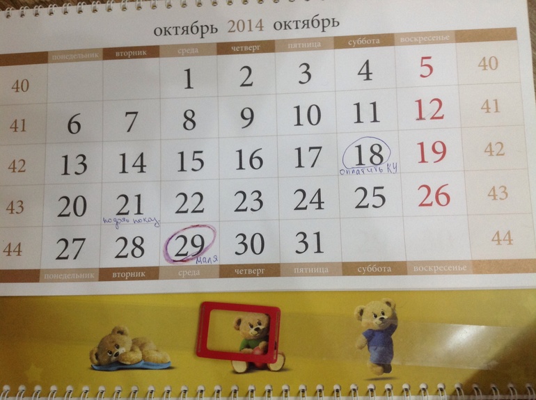 Отчитываемся по заданиямНа этой неделе летела я еле-еле, касаясь земли: "эти дни", доча приболела- в общем, очень достойные оправдания для моей лени. Но довольно быстро я поняла, что в полете мне легче, дома реально чище, и снова встала на крыло. Календарь у меня вот такой, записей в нем очень мало, в основном дни рождения друзей и родственников отмечены. Буду отмечать еще важные дела, со временем.