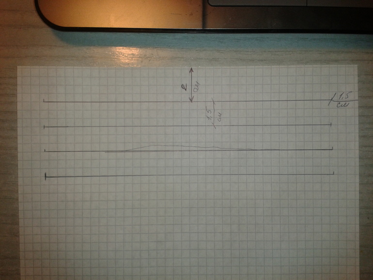 -Делаем разметку на ткани. По длинной стороне отступаем два сантиметра и проводим линию,не доходя до краев 1,5 см.. От нее вниз проводим еще три линий,на расстоянии 1,5 см друг от друга.(показываю на листе бумаги(мелкий прыгает на мне)![]()