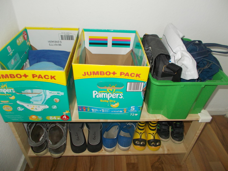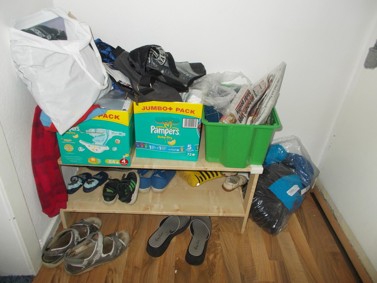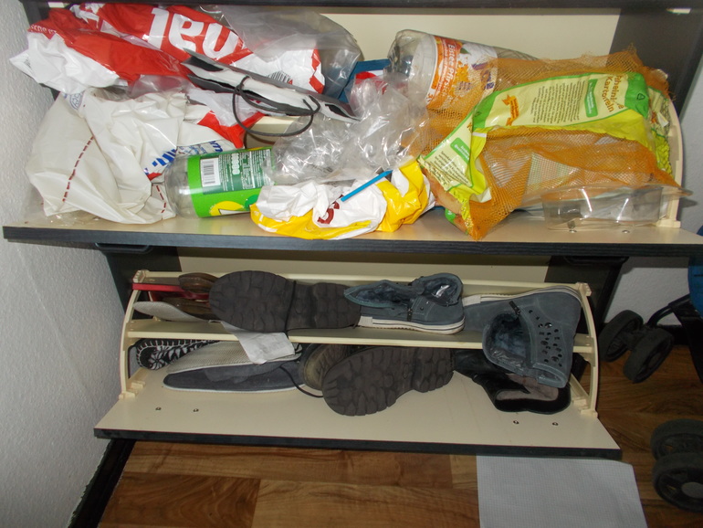 Уборку в зоне 1 (а у меня это коридор и кухня нижнего этажа) решила начать с тумбочки, в которой у нас хранятся мешки, бутылки (здесь в Германии платиковые бутылки сдаются) и неактуальная сезонная обувь. Вот что было.