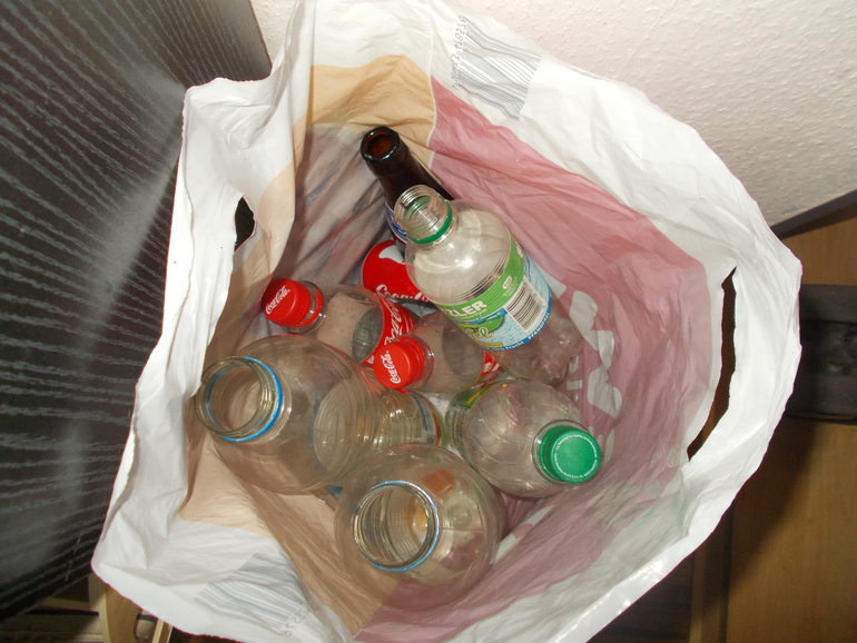 Бутылки сложила в пакет и мы вечером их сдали.