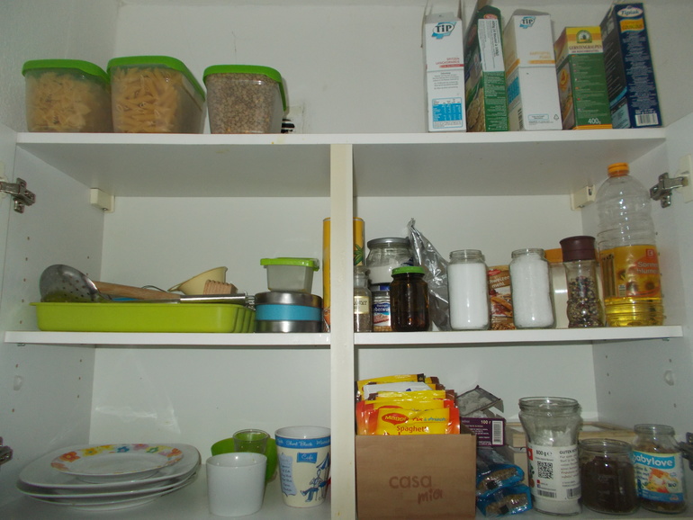 Поэтому решила коробки с мешочками крупы и баночки поднять на самый верх. Думаю, что доставать так будет удобнее. Время покажет...Вот что получилось.