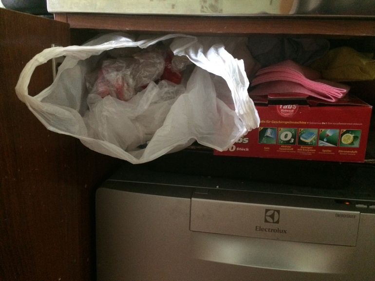 На счет пакетов я фишку давно просекла, что если их сразу не убирать - они захватывают пространство. Поэтому у меня живут маленькие пакетики в пакете под раковиной.