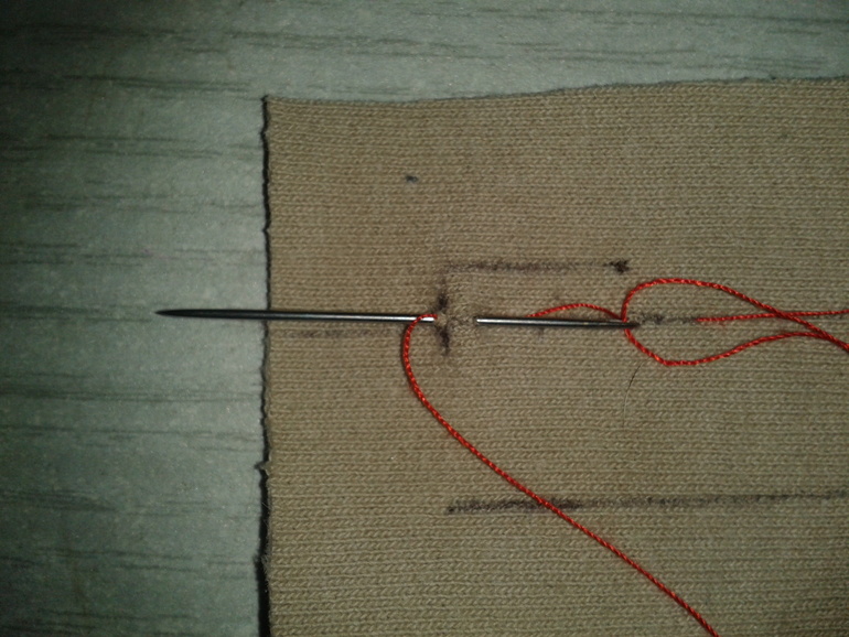 не спешите,следите за тем чтобы проколы ткани были всегда на выбранном расстоянии(3мм и 2 см.)Дойдя до конца строчки делаем закрепку.Для этого последний стежок ,при необходимости, делаем короче и выводим иглу в точке окончания линии