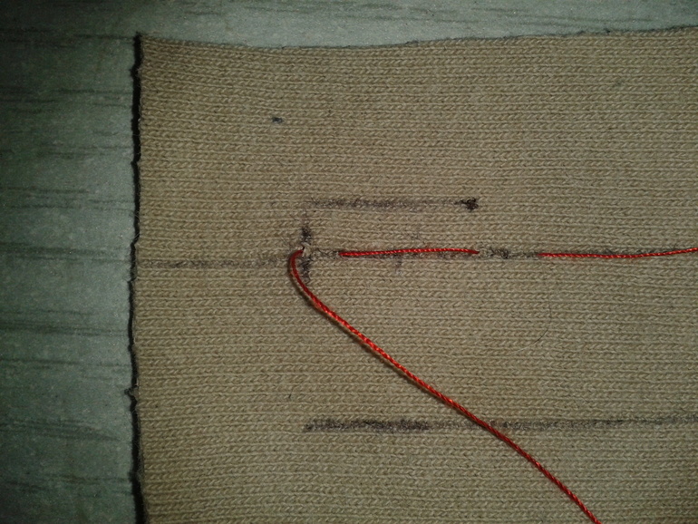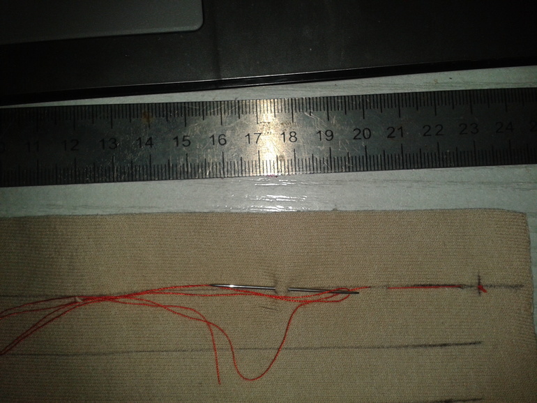 Завязываем узелок и вводим иглу в начало нашей намеченной линии с правой стороны..Через три мм выводим иглу на верх и протягиваем ниточку.Приложите иголку к линейке и зрительно отметьте 2 см и вновь введите иглу в ткань именно на это расстояние. и снова,и снова ,и снова)))До конца строчки.