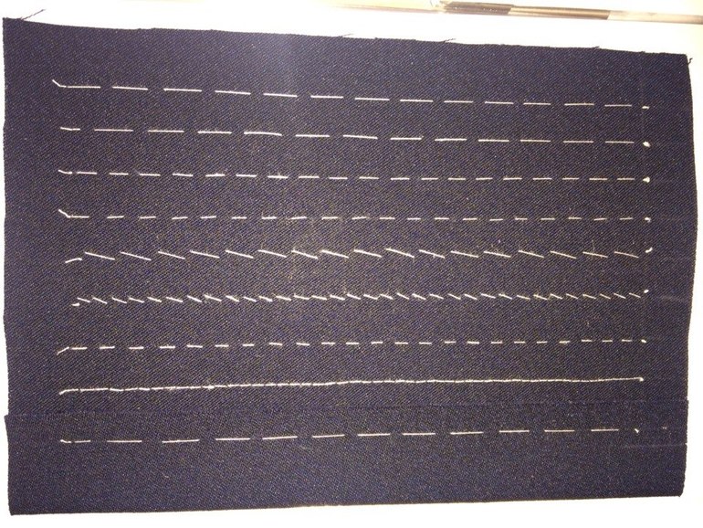Если вы сметываете две детали без посадки( спинка,бочек,детали воротника,манжеты) то длина стежка равна 1,5-2,5 см. Этот же стежок мы будем использовать для прокладывания "важных линий" -талия,середина переда,места расположения карманов и т.д..