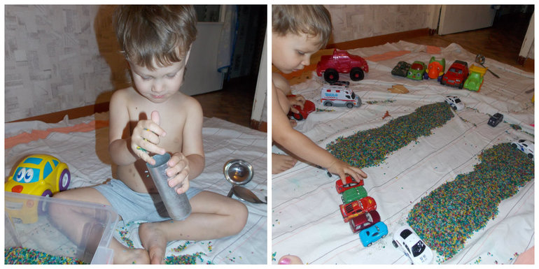 Далее просыпается Ути Бозе Мой, мы полдничаем и идем играть. Хит этого месяца - рис. Задолбалась я его уже по всей квартире выметать, но чем бы дитя не тешилось, лишь бы не истерило развивалось