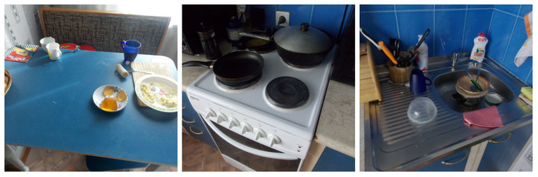 Далее душ, мазюкаюсь лечебными мазями и шагаюшки на кухню. Там меня ждет стакан воды и завтрак. И бардак после завтрака всех тех, у кого терпежу не хватает дождаться меня с моих водных процелур. Завтракаю и благословляю нашу любимую кухню