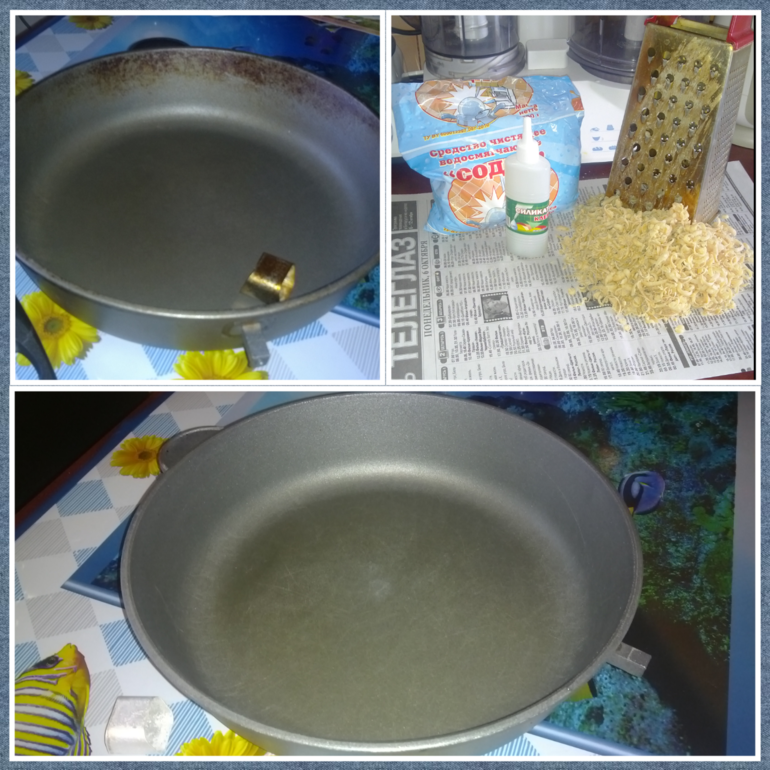 По приходу домой в 14 часов обед и спатки. Пока сынуля спит, на на меня снизошло вдохновение: решила поэкспериментировать с чисткой сковородок. Вот что получилось: