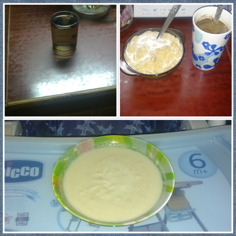 С утра водичка обязательно. Готовим завтрак: сыну-кашку, маме хлопья и, конечно, кофе.