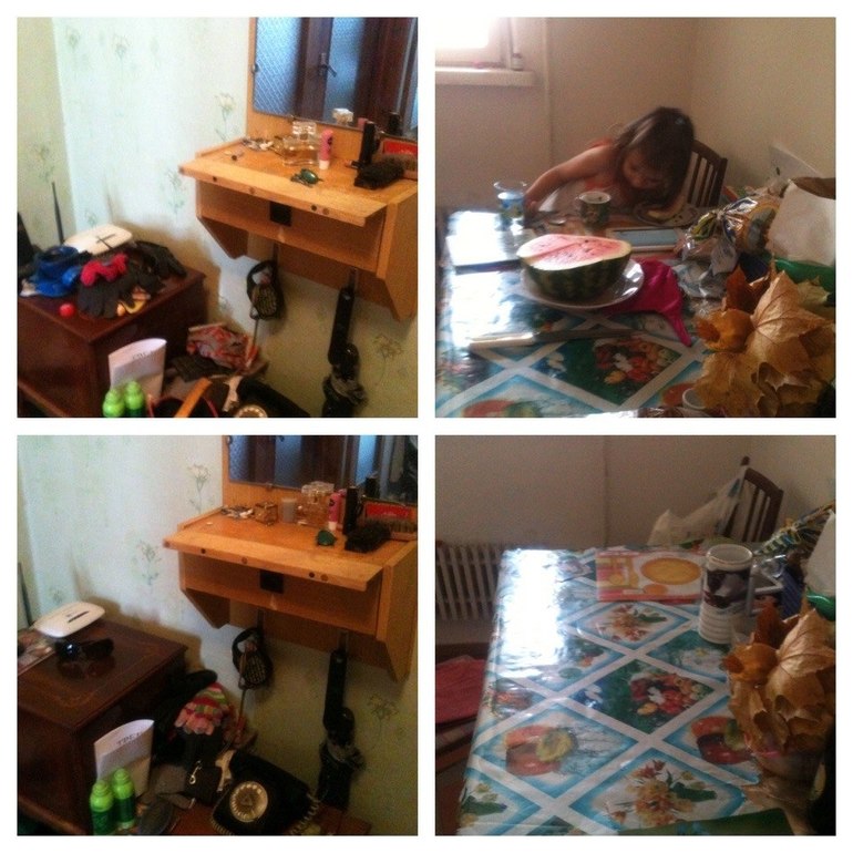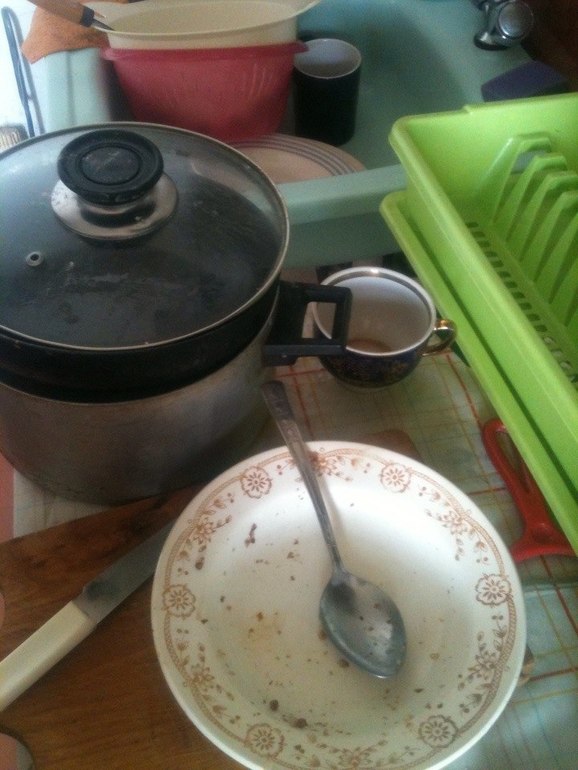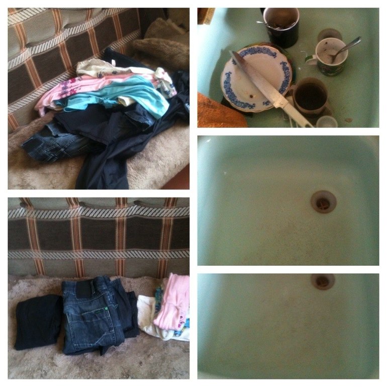 Снимаю вещи со вчеращнего дня и складываю, мою посуду и раковину приводим в порядок.