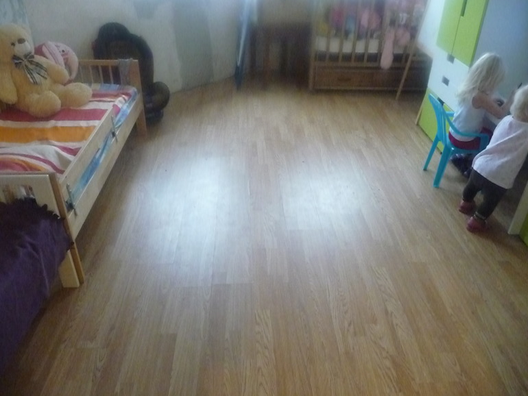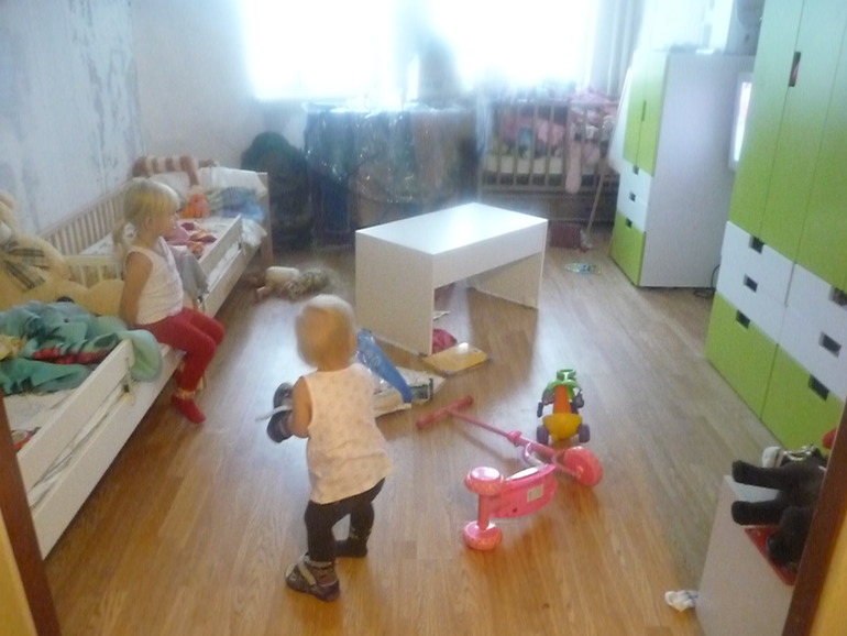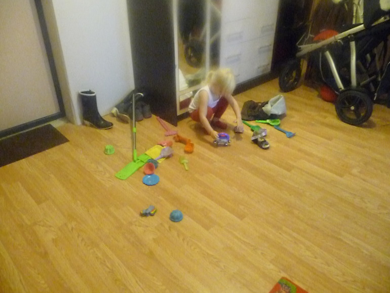Вот это уже интереснее))) Младшая обувается в туфли старшей, на полу валяется самокат, памперсы. И посередине комнаты выдвеут стол)) На уборку ушло минуты 4...
