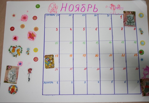 Октябрьский лист используем, а в ноябрьском пока отметили только дни рождения. Похоже, это станет нашей традицией:) и мы самосовершенствуемся! Теперь дочка не только клеит наклейки, но и добавляет своего личного творчества =)