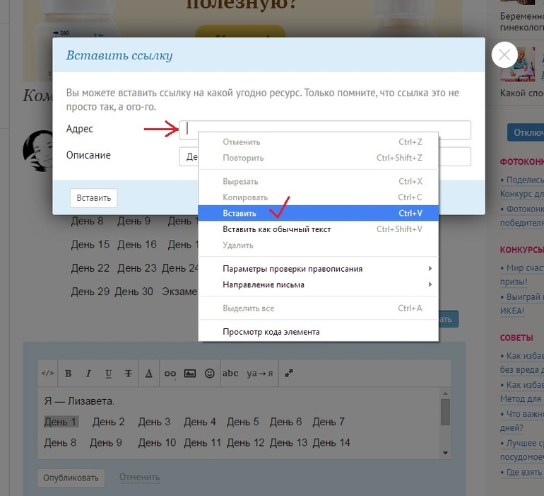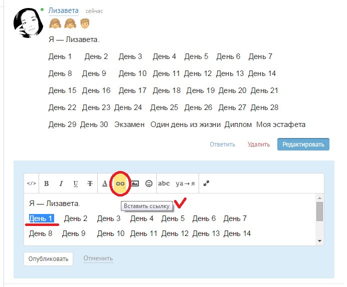 Выделяете день, к которому написан отчет. Нажимаете на значок «вставить ссылку»